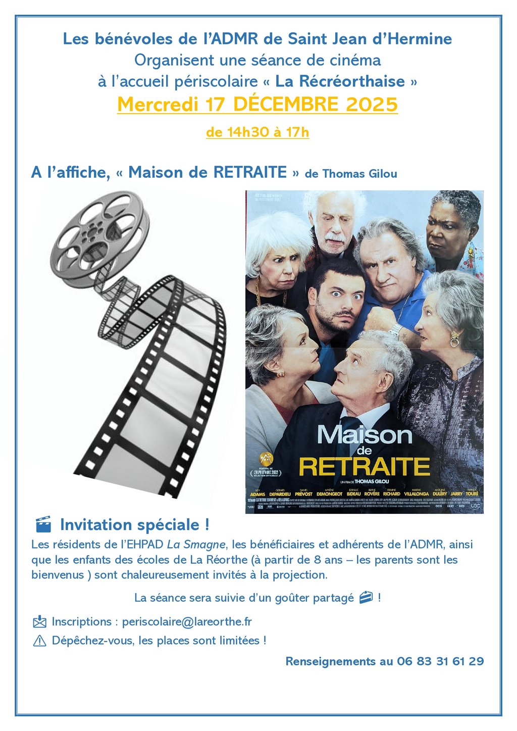 👉 Les bénévoles de l'ADMR de Saint-Jean-D'Hermine organisent une séance de cinéma à l'accueil périscolaire " La Récréorthaise "