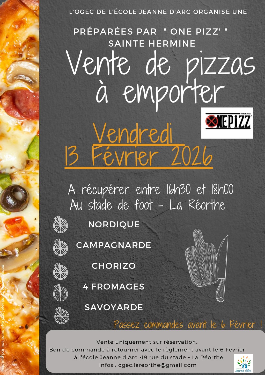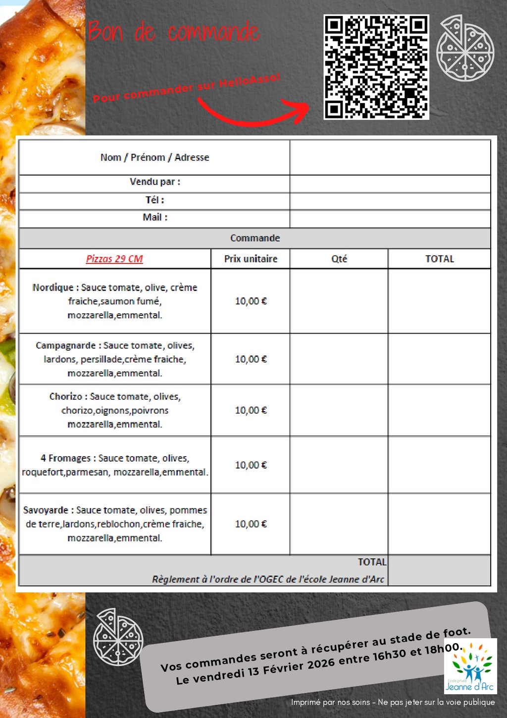 👉 L'Ogec de l'école Jeanne d'Arc organise une vente de pizzas le 16 février 2026 à récupérer au stade de foot.