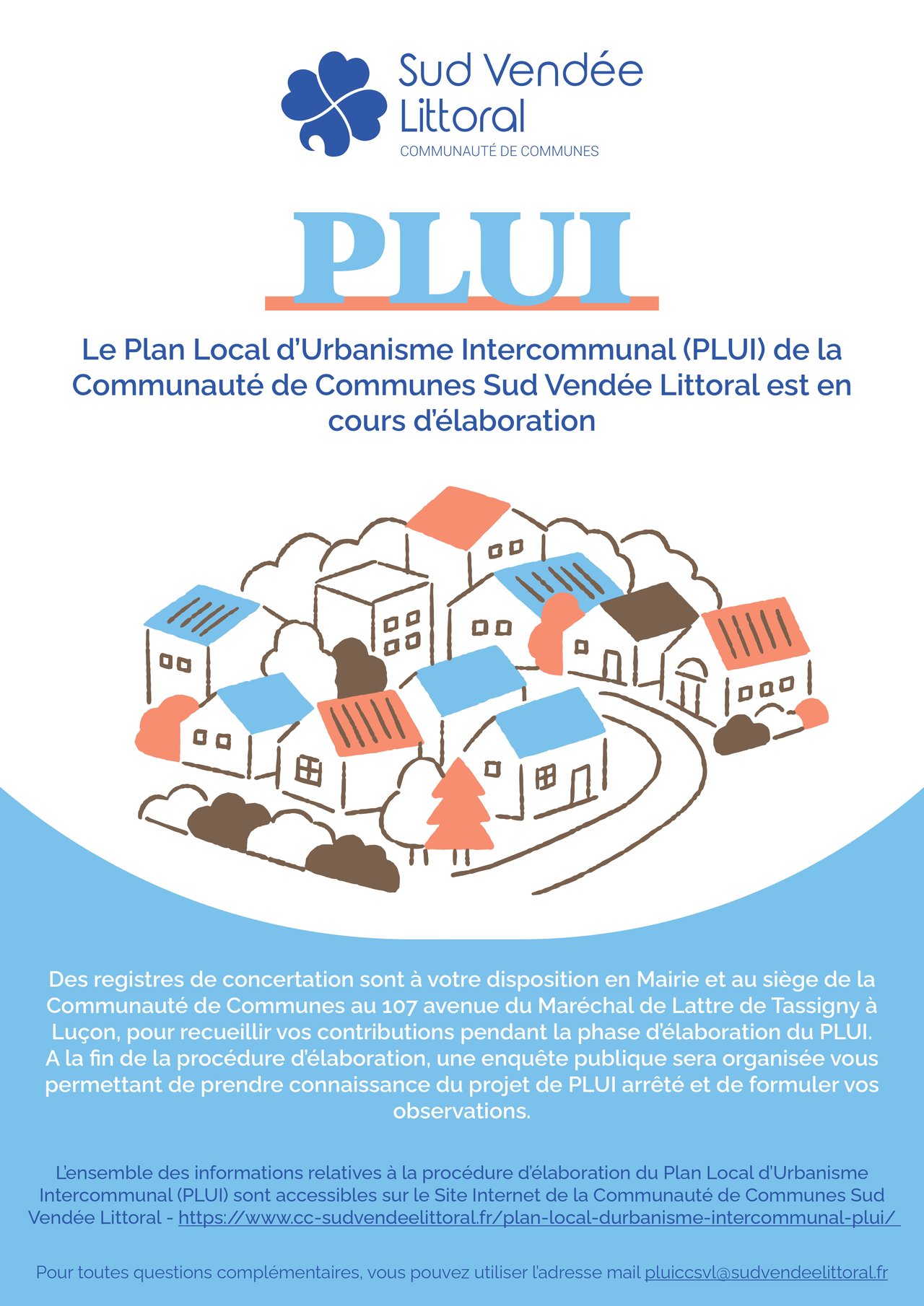 ❔ Pour toutes questions complémentaires, vous pouvez utiliser l’adresse mail suivante : pluiccsvl@sudvendeelittoral.fr