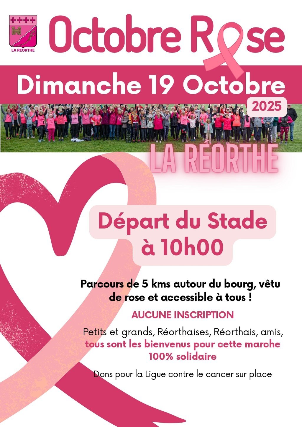 đ Cette annĂ©e, la marche " Octobre Rose " aura lieu le Dimanche 19 Octobre 2025 avec un dĂ©part du Stade Ă 10h00.